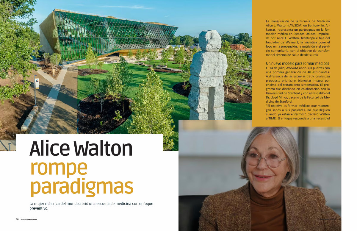 La inauguración de la Escuela de Medicina Alice L. Walton( AWSOM) en Bentonville, Arkansas, representa un parteaguas en la formación médica en Estados Unidos. Impulsada por Alice L. Walton, filántropa e hija del fundador de Walmart, la iniciativa pone el foco en la prevención, la nutrición y el servicio comunitario, con el objetivo de transformar el sistema de salud desde su raíz.