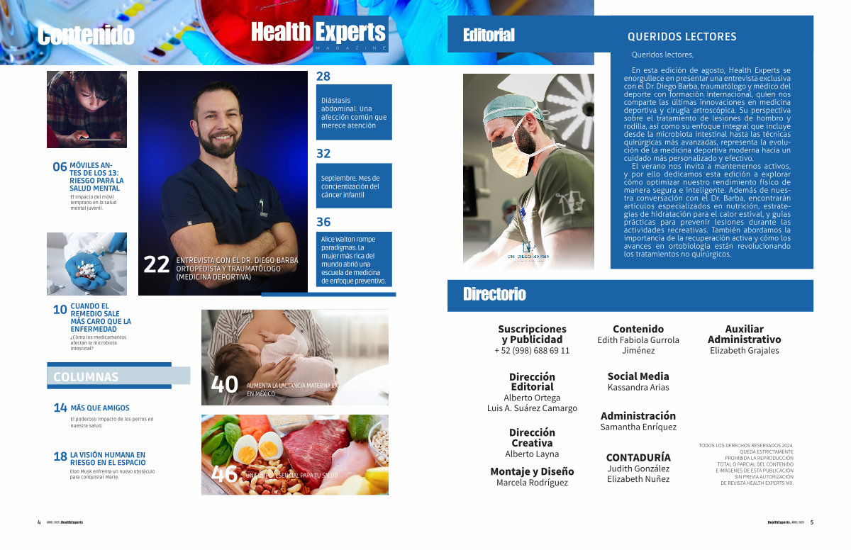 En esta edición de agosto, Health Experts se enorgullece en presentar una entrevista exclusiva con el Dr. Diego Barba, traumatólogo y médico del deporte con formación internacional, quien nos comparte las últimas innovaciones en medicina deportiva y cirugía artroscópica. Su perspectiva sobre el tratamiento de lesiones de hombro y rodilla, así como su enfoque integral que incluye desde la microbiota intestinal hasta las técnicas quirúrgicas más avanzadas, representa la evolución de la medicina deportiva moderna hacia un cuidado más personalizado y efectivo.