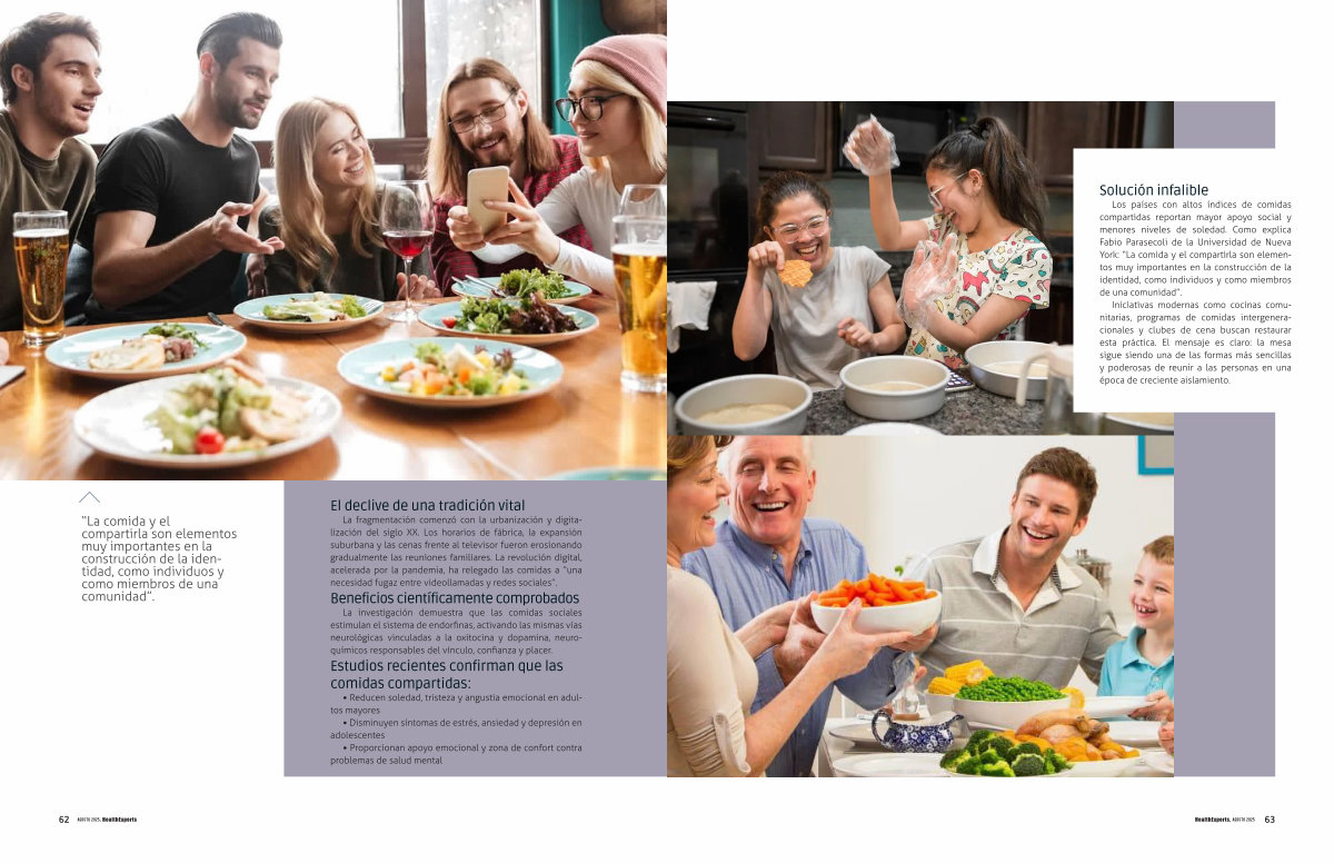 Los países con altos índices de comidas compartidas reportan mayor apoyo social y menores niveles de soledad. Como explica Fabio Parasecoli de la Universidad de Nueva York:“ La comida y el compartirla son elementos muy importantes en la construcción de la identidad, como individuos y como miembros de una comunidad”.