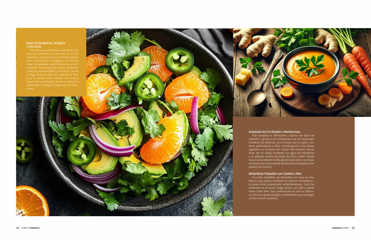 Esta sopa es perfecta para calentarse y llenarse de nutrientes . La zanahoria es rica en vitamina A , esencial para el sistema inmunitario , mientras que el jengibre y la cúrcuma tienen propiedades antiinflamatorias y antioxidantes . Para prepararla , saltea zanahorias y cebolla , añade jengibre y cúrcuma , y cocina a fuego lento en caldo de verduras . Al final , licua la mezcla hasta obtener una textura suave . Esta combinación ayuda a combatir la inflamación y protege al organismo de infecciones .