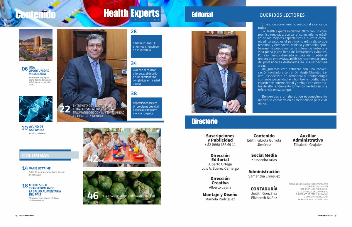 En Health Experts iniciamos 2026 con un compromiso renovado: acercar el conocimiento médico de los mejores especialistas a nuestra comunidad. La salud es el patrimonio más valioso que tenemos, y entenderla, cuidarla y atenderla oportunamente puede marcar la diferencia entre una vida plena y una llena de limitaciones evitables. Por eso, hemos diseñado un calendario editorial repleto de entrevistas, análisis y recomendaciones de profesionales destacados en sus respectivas áreas.