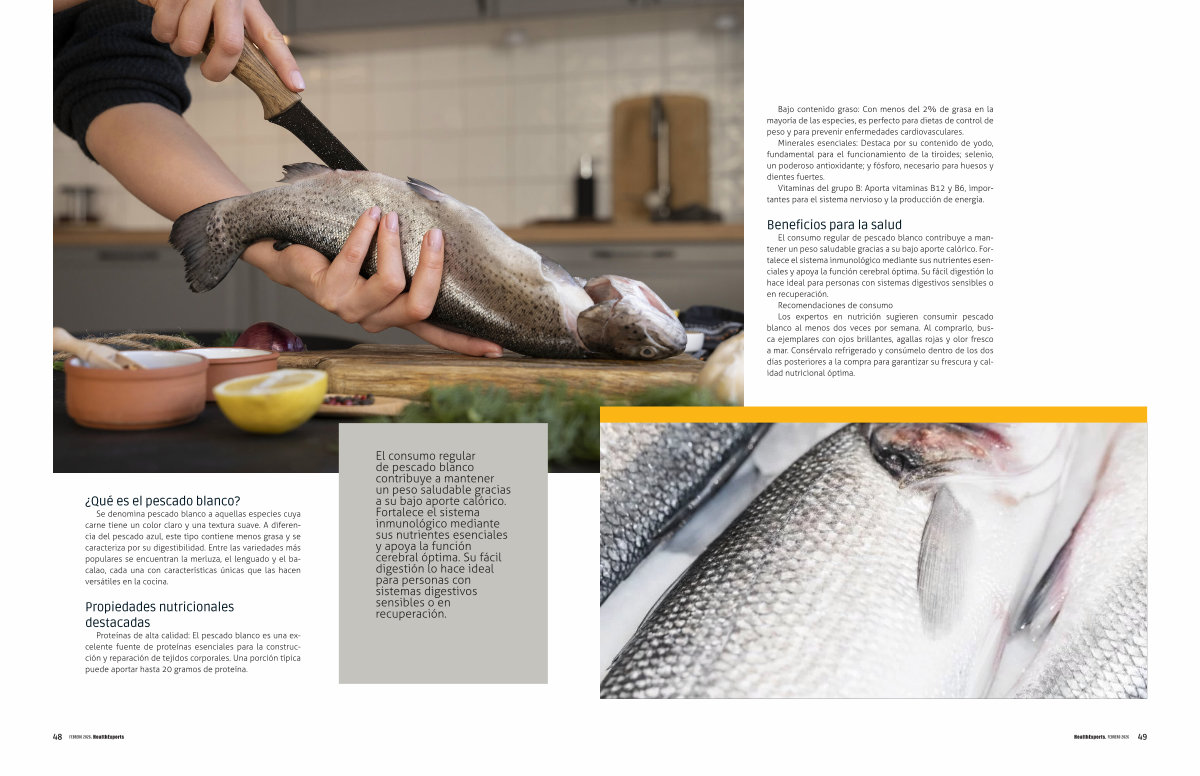 Proteínas de alta calidad: El pescado blanco es una excelente fuente de proteínas esenciales para la construcción y reparación de tejidos corporales. Una porción típica puede aportar hasta 20 gramos de proteína.