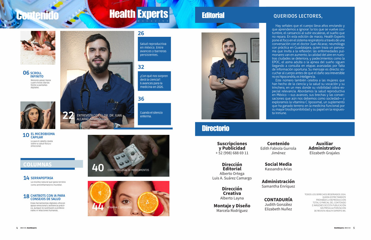 Hay señales que el cuerpo lleva años enviando y que aprendemos a ignorar: la tos que se vuelve costumbre, el cansancio al subir escaleras, el sueño que no repara. En esta edición de marzo, Health Experts pone el foco en el sistema respiratorio a través de una conversación con el doctor Juan Alcaraz, neumólogo con práctica en Guadalajara, quien traza un panorama que invita a la reflexión: las enfermedades pulmonares van en aumento, la calidad del aire en nuestras ciudades se deteriora, y padecimientos como la EPOC, el asma adulta o la apnea del sueño siguen llegando a consulta en etapas avanzadas por falta de información oportuna. Su mensaje es directo: escuchar al cuerpo antes de que el daño sea irreversible no es hipocondría, es inteligencia.