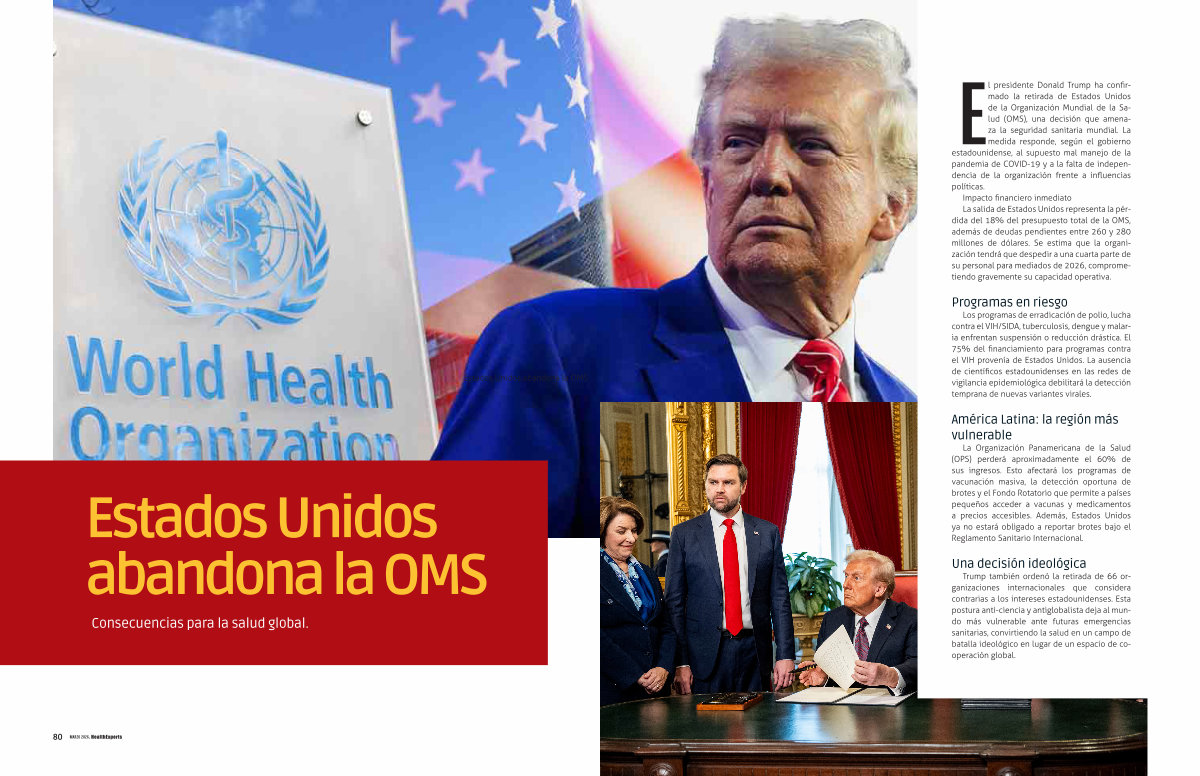 La Organización Panamericana de la Salud( OPS) perderá aproximadamente el 60 % de sus ingresos. Esto afectará los programas de vacunación masiva, la detección oportuna de brotes y el Fondo Rotatorio que permite a países pequeños acceder a vacunas y medicamentos a precios accesibles. Además, Estados Unidos ya no estará obligado a reportar brotes bajo el Reglamento Sanitario Internacional.