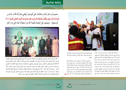 013 والذي2 يهتفل به العالم, وش�هد كورنيش� عدةٔابوظبي فعاليات ش�اركت فيها كافة فئات المجتمع من طلاب المدارس� وأولياء الأمور فض�لاً عن فئات المزارعين حيش نظم المركز مس�يرة حاش�دة تحت عنوان ' من اجلٔ المياه '' كما تم توزيع نش�رات توعية وتنظيم مس�ابقات وبرامج ترفيهية قدمتها مذيعة ' �تار اف امٔ '' ش�يماء حافظ ، لتركيز الانتباه على اهميةٔ المياه وض�رورة العمل على ادارةٕ مواردنا الماءية بطريقة مس�تدامة تض�من للأجيال القادمة حقهم في العيش� بدون معاناة.
