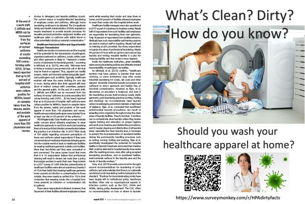 Healthcare facility managers were also questioned in 2015 as part of a business-to-business survey . Nearly half of respondents from such facilities said employees are responsible for laundering their own garments . Only 14 percent of respondents from facilities where individuals have such responsibility said training sessions are held to instruct staff in washing . Nearly half said no training at all is provided . But these respondents recognize the value of professional laundering . Nearly 90 percent of those with an opinion said outsourcing laundry and renting reusable textiles is a plus for reducing liability and that rental is more hygienic .