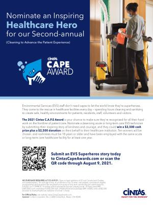 The 2021 Cintas C . A . P . E Award is your chance to make sure they ’ re recognized for all their hard work on the frontline of patient care . Nominate a deserving acute or long-term care EVS technician by submitting their inspiring story of kindness and courage , and they could win a $ 2,500 cash prize plus a $ 2,500 donation on their behalf to their healthcare institution . Ten winners will be chosen , and nominees must be 18 years or older and have been employed with the same acute or long-term care healthcare facility for at least one year .