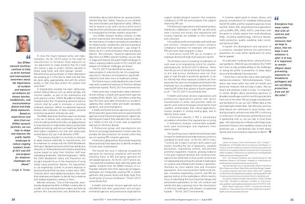 “ I think that it will be like many other pathogens and become endemic ,” Mitchell emphasizes . “ Emergence may mean rather that with all controls and protective measures that we keep in place , that we keep it and whatever is after it at bay . It is important to remain diligent about preventing exposures to bloodborne pathogens and not sacrificing protections from one for the other . We encourage manufacturers and distributors to use our 2021 EPINet data as free and meaningful market data . Year after year , we know what devices are continuing to cause injuries , even during activation and we know what PPE is continuing to not be worn . If manufacturers and distributors work in partnership with us , we can help to close those gaps – like improving use of devices with sharps injury prevention features and needleless systems and eye protection use — and diminish risks of both sharps injuries and mucocutaneous exposure incidents .”