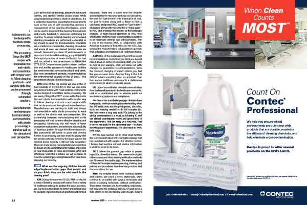 MW : One of the big lessons we saw in the SP field ( outside of COVID-19 ) is that we can solve long-term problems with novel solutions . Instruments can be designed to facilitate sterile processing . We are seeing things like ERCP scopes with disposable tips and robotic instrumentation with simpler easy to follow cleaning protocols – and surgical drills that can be processed through automated washers . Manufacturers are learning to build and design instrumentation with sterile processing in mind as well as the clinical end user perspective . This partnership between manufacturing and sterile processing will lead to more effective cleaning and processing . Ultimately , this will result in fewer instrument malfunctions and eliminate the possibility of injuring a patient through bloodborne exposure . This partnership still needs to grow and develop further . As an industry , we have made headway with key vendor partners ; however , the larger scale of the medical device industry is still not fully integrated . There are many device manufacturers who continue to design and release instruments that are impossible or near impossible to clean and sterilize safely and effectively . Until this is solved , we will continue to have the systemic processing failures that have been plaguing our industry .