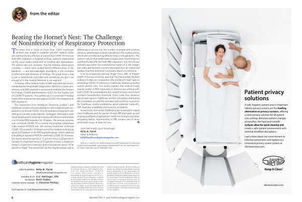Healthcare Hygiene magazine is published monthly by Keystone Media Inc . 8955 Ridgeline Blvd ., Suite 500 , Highlands Ranch , CO 80129 . Free digital subscriptions available at www . healthcarehygienemagazine . com for U . S ., Canada and other foreign subscribers . Copyright © 2022 Keystone Media Inc . All rights reserved . The publisher reserves the right to accept or reject any advertising or editorial material . Advertisers , and / or their agents , assume the responsibility for all content of published advertisements and assume responsibility for any claims against the publisher based on the advertisement . Editorial contributors assume responsibility for their published works and assume responsibility for any claims against the publisher based on the published work . All items submitted to Healthcare Hygiene magazine become the sole property of Keystone Media Inc . Editorial content may not necessarily reflect the views of the publisher . No part of this publication may be reproduced in any form or by any electronic or mechanical means , including information storage and retrieval systems , without permission in writing from the publisher .