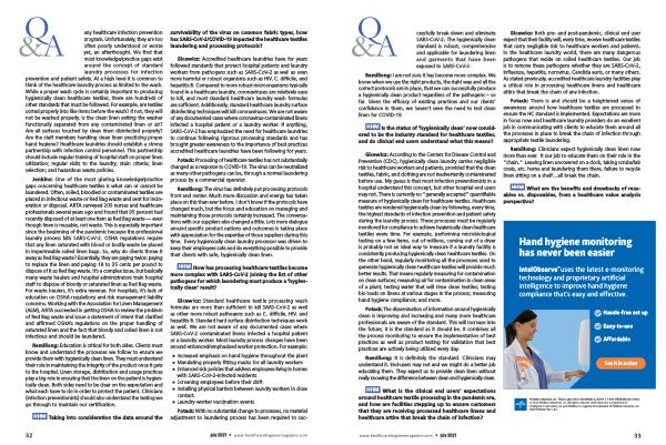 Q A & any healthcare infection prevention program . Unfortunately , they are too often poorly understood or worse yet , an afterthought . We find that most knowledge / practice gaps exist around the concept of standard laundry processes for infection prevention and patient safety . At a high level it is common to think of the healthcare laundry process as limited to the wash . While a proper wash cycle is certainly important to producing hygienically clean healthcare textiles , there are hundreds of other standards that must be followed . For example , are textiles sorted properly into like items before the wash ? If not , they will not be washed properly . Is the clean linen exiting the washer functionally separated from any contaminated linen or air ? Are all surfaces touched by clean linen disinfected properly ? Are the staff members handling clean linen practicing proper hand hygiene ? Healthcare laundries should establish a strong partnership with infection control personnel . This partnership should include regular training of hospital staff on proper linen utilization ; regular visits to the laundry ; stain criteria ; linen selection ; and hazardous waste policies .