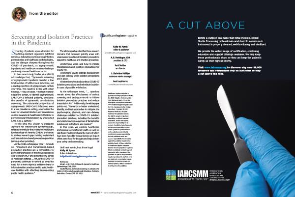 Healthcare Hygiene magazine is published monthly by Keystone Media Inc . 8925 Ridgeline Boulevard , suite 106 , Highlands Ranch , CO 80129 . Free digital subscriptions available at www . healthcarehygienemagazine . com for U . S ., Canada and other foreign subscribers . Copyright © 2021 Keystone Media Inc . All rights reserved . The publisher reserves the right to accept or reject any advertising or editorial material . Advertisers , and / or their agents , assume the responsibility for all content of published advertisements and assume responsibility for any claims against the publisher based on the advertisement . Editorial contributors assume responsibility for their published works and assume responsibility for any claims against the publisher based on the published work . All items submitted to Healthcare Hygiene magazine become the sole property of Keystone Media Inc . Editorial content may not necessarily reflect the views of the publisher . No part of this publication may be reproduced in any form or by any electronic or mechanical means , including information storage and retrieval systems , without permission in writing from the publisher .