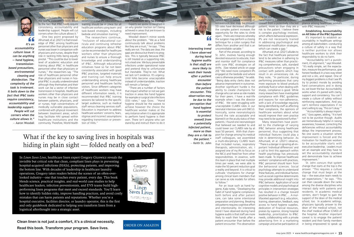 It’ s an accountability culture issue. It can be anything— hand hygiene, transmissionbased precautions, environmental cleaning and disinfection. The complexity of the task is irrelevant. It boils down to the fact that IP & C tasks require consistency, accountability and leadership support.