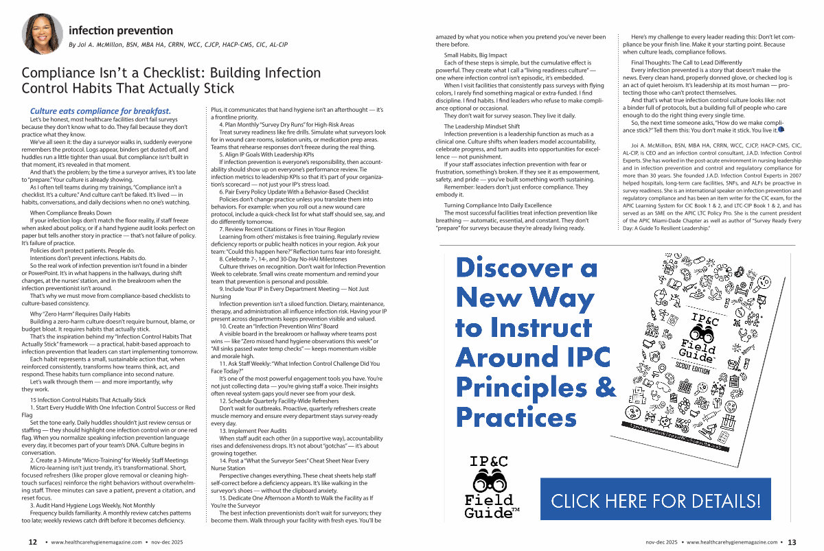 Joi A. McMillon, BSN, MBA HA, CRRN, WCC, CJCP, HACP-CMS, CIC, AL-CIP, is CEO and an infection control consultant, J. A. D. Infection Control Experts. She has worked in the post-acute environment in nursing leadership and in infection prevention and control and regulatory compliance for more than 30 years. She founded J. A. D. Infection Control Experts in 2007 helped hospitals, long-term care facilities, SNFs, and ALFs be proactive in survey readiness. She is an international speaker on infection prevention and regulatory compliance and has been an item writer for the CIC exam, for the APIC Learning System for CIC Book 1 & 2, and LTC-CIP Book 1 & 2, and has served as an SME on the APIC LTC Policy Pro. She is the current president of the APIC Miami-Dade Chapter as well as author of“ Survey Ready Every Day: A Guide To Resilient Leadership.” nov-dec 2025 • www. healthcarehygienemagazine. com •