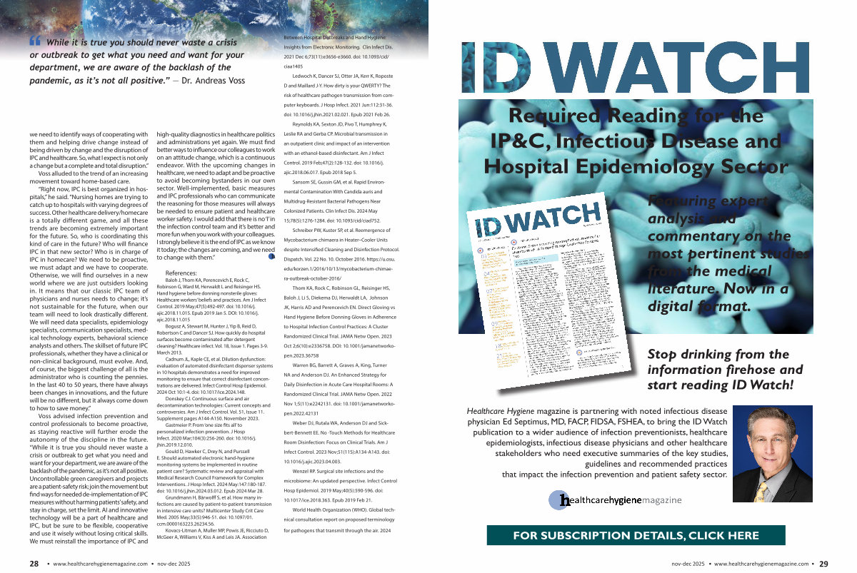 Voss advised infection prevention and control professionals to become proactive, as staying reactive will further erode the autonomy of the discipline in the future.“ While it is true you should never waste a crisis or outbreak to get what you need and want for your department, we are aware of the backlash of the pandemic, as it’ s not all positive. Uncontrollable green caregivers and projects are a patient-safety risk; join the movement but find ways for needed de-implementation of IPC measures without harming patients’ safety, and stay in charge, set the limit. AI and innovative technology will be a part of healthcare and IPC, but be sure to be flexible, cooperative and use it wisely without losing critical skills. We must reinstall the importance of IPC and high-quality diagnostics in healthcare politics and administrations yet again. We must find better ways to influence our colleagues to work on an attitude change, which is a continuous endeavor. With the upcoming changes in healthcare, we need to adapt and be proactive to avoid becoming bystanders in our own sector. Well-implemented, basic measures and IPC professionals who can communicate the reasoning for those measures will always be needed to ensure patient and healthcare worker safety. I would add that there is no‘ I’ in the infection control team and it’ s better and more fun when you work with your colleagues. I strongly believe it is the end of IPC as we know it today; the changes are coming, and we need to change with them.”