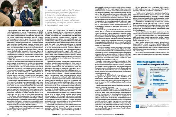 As Dallas , et al . ( 2018 ) observe , “ The hazard for the spread of infectious disease is elevated in the presence of any human migration , but especially that of undocumented immigration . Migrants , documented and undocumented , carry with them elements of their past , including disease . If immigrants to the United States are not regulated in a public health sense , then what they bring with them , especially in terms of health status , cannot be regulated either . Logically , undocumented immigration could then result in the undocumented spread of infectious disease , which is a formula for creating significant impediments to the role of public health protection . The spread of Hansen ’ s disease ( HD ) and the concern of herd immunity are examples of how undocumented immigration impacts public health in the United States . Undocumented immigration has the potential to put the United States at risk for outbreaks of infectious disease , while simultaneously masking the individual source of the threat . This makes mitigation of the potential danger that much more difficult to achieve .”