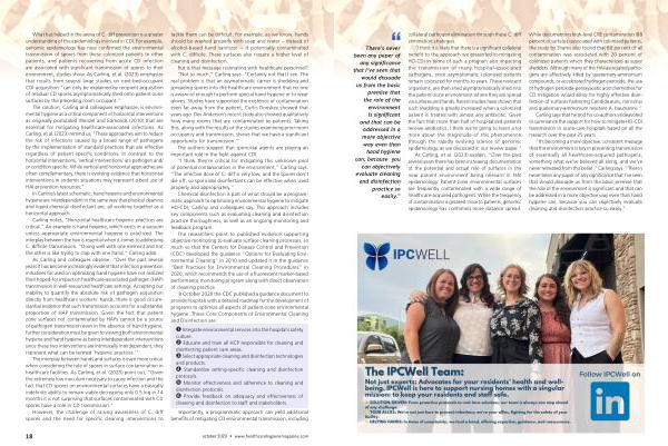 “ It ’ s becoming a more objective , consistent message that the environment is key in preventing transmission of essentially all healthcare-acquired pathogens , something what we ’ ve believed all along , and we ’ ve never retreated from this belief ,” Carling says . “ There ’ s never been any paper of any significance that I ’ ve seen that would dissuade us from the basic premise that the role of the environment is significant and that can be addressed in a more objective way even than hand hygiene can , because you can objectively evaluate cleaning and disinfection practice so easily .”
