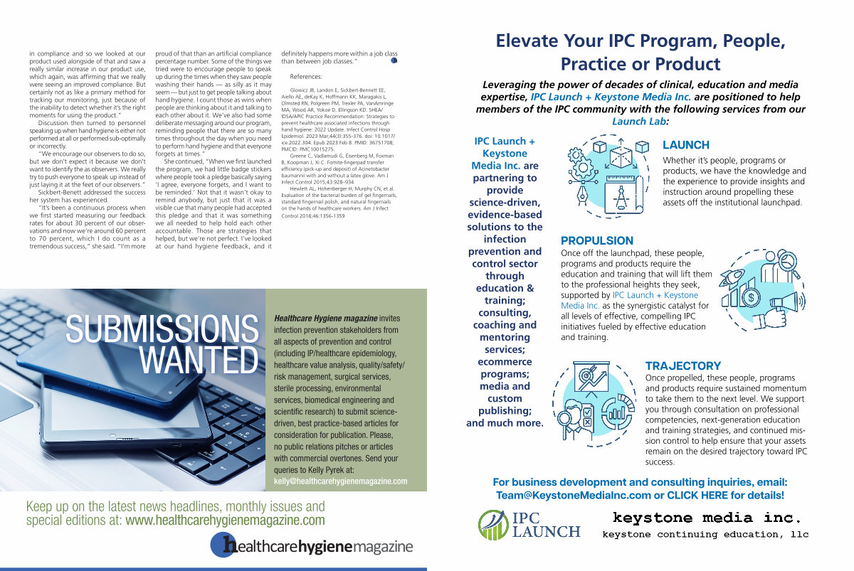 Healthcare Hygiene magazine invites infection prevention stakeholders from all aspects of prevention and control( including IP / healthcare epidemiology, healthcare value analysis, quality / safety / risk management, surgical services, sterile processing, environmental services, biomedical engineering and scientific research) to submit sciencedriven, best practice-based articles for consideration for publication. Please, no public relations pitches or articles with commercial overtones. Send your queries to Kelly Pyrek at: kelly @ healthcarehygienemagazine. com