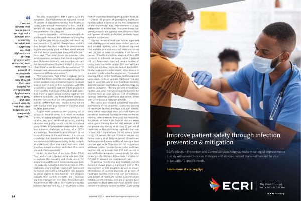 “ It was no surprise that low-resource settings had a problem with resources , but what was surprising was that high-resource settings struggled with resources , even more than 70 percent of respondents said that they thought that their budgets for environmental hygiene were pretty good , and their overall attitude was that their programs were adequately effective ,” Peters says . “ Then when we see the responses to the survey questions , we realize that there ’ s a significant issue . Unless you know you have a problem , you can ’ t fix it because you won ’ t know to address it , of course . I think there ’ s a gap between the perceptions of EVS managers and personnel who are responsible for the environmental hygiene program .”