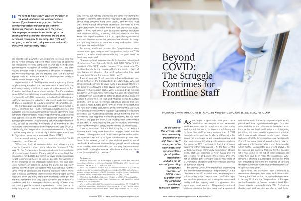 But beyond COVID , how are staff still experiencing the more long-term impacts of the pandemic ? Or is it “ business as usual ?” In the Midwest , we are very much still adapting to the “ new normal .” Staff shortages across all disciplines ( not just nursing ) are a continued reality and the ongoing need to supplement with agency and travel solutions . This presents continued pressure to ensure that temporary staff are provided with the baseline information they need on policies and procedures for the organization and support for shared accountability for the outcomes in the organization . Each facility has developed local protocols targeting prioritized risks and quality improvement activities which may include different products and different techniques that the temporary teams are familiar with . Current electronic medical record systems may not adequately reflect any deviations from those bundles which further complicates post event analysis . To be clear , we are infinitely thankful for the clinicians who have come to the aid of local hospitals ; too often they have been made the scapegoats . What remains is creating a sustainable solution for more fully integrating them into the nuances of care and the team-building between local and contracted staff to optimize care given .
