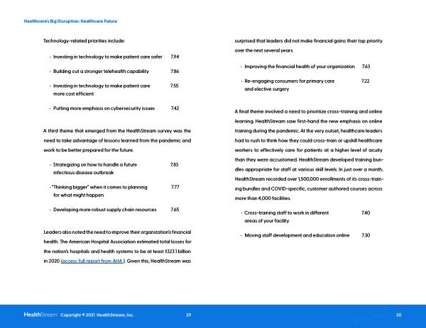 A final theme involved a need to prioritize cross-training and online learning . HealthStream saw first-hand the new emphasis on online training during the pandemic . At the very outset , healthcare leaders had to rush to think how they could cross-train or upskill healthcare workers to effectively care for patients at a higher level of acuity than they were accustomed . HealthStream developed training bundles appropriate for staff at various skill levels . In just over a month , HealthStream recorded over 1,500,000 enrollments of its cross-training bundles and COVID-specific , customer authored courses across more than 4,000 facilities .