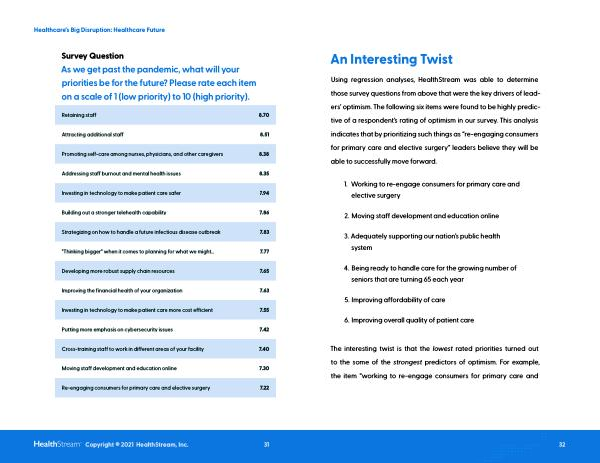 Using regression analyses , HealthStream was able to determine those survey questions from above that were the key drivers of leaders ’ optimism . The following six items were found to be highly predictive of a respondent ’ s rating of optimism in our survey . This analysis indicates that by prioritizing such things as “ re-engaging consumers for primary care and elective surgery ” leaders believe they will be able to successfully move forward .