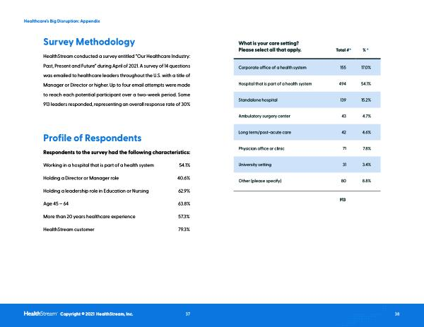 HealthStream conducted a survey entitled “ Our Healthcare Industry : Past , Present and Future ” during April of 2021 . A survey of 14 questions was emailed to healthcare leaders throughout the U . S . with a title of Manager or Director or higher . Up to four email attempts were made to reach each potential participant over a two-week period . Some 913 leaders responded , representing an overall response rate of 30 %