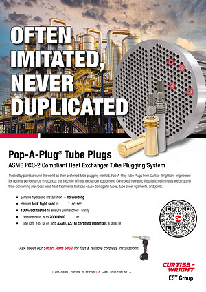 Trusted by plants around the world as their preferred tube plugging method, Pop-A-Plug Tube Plugs from Curtiss-Wright are engineered for optimal performance throughout the lifecycle of heat exchanger equipment. Controlled hydraulic installation eliminates welding and time-consuming pre- / post-weld heat treatments that can cause damage to tubes, tube sheet ligaments, and joints.
