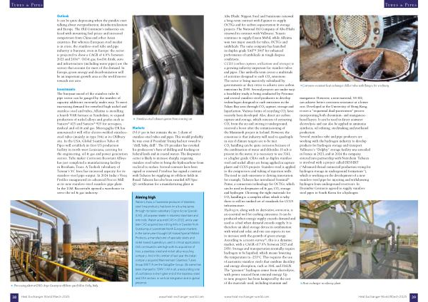 Abu Dhabi . Nippon Steel and Sumitomo renewed a long-term contract with Equinor to supply OCTGs and for carbon sequestration & storage projects . The National Oil Company of Abu Dhabi renewed its contract with Vallourec . Tenaris continues to supply Exxon Mobil , while Alleima won two major awards for tubes , OCTGs and umbilicals . The same company has launched its duplex grade SAF™ 3007 for enhanced performance of umbilicals in tough deepsea conditions . CCUS ( carbon capture , utilization and storage ) is a growing industry important for stainless tubes and pipes . This umbrella term covers a multitude of activities designed to curb CO 2 emissions . The sector is being massively subsidized by governments as they strive to achieve zero carbon emissions by 2050 . Several projects are under way : a feasibility study is being conducted by Petronas and several stainless-steel producers to develop technologies designed to curb emissions in the Tokyo Bay area through CO 2 capture , storage and liquefaction . Various forms of recycling CO 2 have recently been developed . Also , direct air carbon capture and storage , which consists of extracting CO 2 from the air and storing it underground , received a boost after the commissioning of the Mammoth project in Iceland . However , the consensus is that industry will need to quadruple in size if climate targets are to be met . CO 2 handling can be quite corrosive because of the combination of water and chlorides . If salt is present in the water , it is necessary to use 316L or a higher grade . CRAs such as duplex stainless steel and nickel alloys are being applied in capture plants and CCUS projects . Stainless steel is applied to the compressors and tubing of injection wells . The need to curb emissions is driving innovation : for example , Tubacex has introduced Sentinal ® Prime , a connection technology for OCTGs , which can be used in deepwater oil & gas , CO 2 storage and hydrogen . Choosing the right materials for CO 2 handling is a complex affair , which is why there is still no unified set of standards for CCUS infrastructure . Hydrogen , along with its derivative , ammonia , is an essential tool for curbing emissions . It can be produced when energy supply exceeds demand and used as a fuel when demand exceeds supply . It is therefore an ideal storage device in combination with wind and solar , and one can expects its use to increase with the growth of green energy . According to a recent survey ( 2 ) , this is a dynamic market , with a CAGR of 7.8 % between 2025 and 2050 . Storage and transportation normally require hydrogen to be liquified , which means lowering the temperature to -253 ° C . This requires the use of austenitic stainless steels that combine ductility and energy absorption , such as 316L and 316LN . The “ greenest ” hydrogen comes from electrolysis , with power sourced from renewal energy . Up to now , progress has been hampered by the cost of the materials used , including titanium and