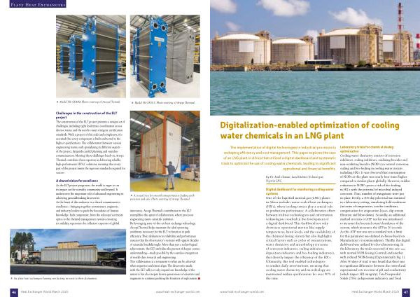 Digital dashboard for monitoring cooling water systems One of the liquefied natural gas ( LNG ) plants in Africa includes water-cooled heat exchangers ( HX ’ s ), where cooling towers play a crucial role in production performance . A collaborative effort between utilities technologists and information technologists resulted in the development of a digital dashboard . This dashboard not only showcases operational metrics like supply temperatures , basin levels , and the availability of the chemical dosing system but also highlights critical factors such as cycles of concentrations , water chemistry and microbiology ( in terms of corrosion indicators , scaling indicators , deposition indicators and bio-fouling indicators ), that directly impact the efficiency of the HX ’ s . Ultimately , this tool enabled technologists to conduct daily interventions , ensuring that cooling water chemistry and microbiology are maintained within specifications for over 90 % of the time .