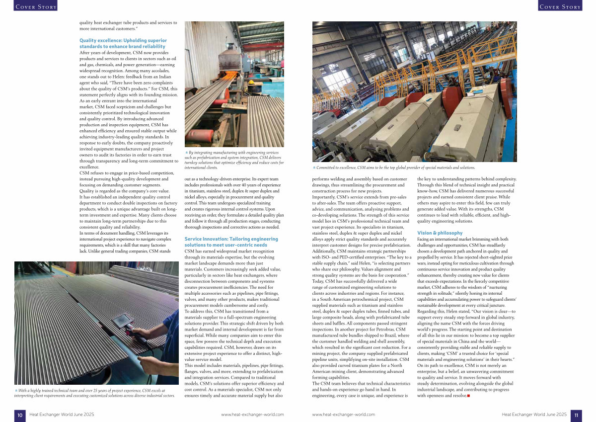 performs welding and assembly based on customer drawings, thus streamlining the procurement and construction process for new projects. Importantly, CSM’ s service extends from pre-sales to after-sales. The team offers proactive support, advice, and communication, analysing problems and co-developing solutions. The strength of this service model lies in CSM’ s professional technical team and vast project experience. Its specialists in titanium, stainless steel, duplex & super duplex and nickel alloys apply strict quality standards and accurately interpret customer designs for precise prefabrication. Additionally, CSM maintains strategic partnerships with ISO- and PED-certified enterprises.“ The key to a stable supply chain,” said Helen,“ is selecting partners who share our philosophy. Values alignment and strong quality systems are the basis for cooperation.” Today, CSM has successfully delivered a wide range of customized engineering solutions to clients across industries and regions. For instance, in a South American petrochemical project, CSM supplied materials such as titanium and stainless steel, duplex & super duplex tubes, finned tubes, and large composite heads, along with prefabricated tube sheets and baffles. All components passed stringent inspections. In another project for Petrobras, CSM manufactured tube bundles shipped to Brazil, where the customer handled welding and shell assembly, which resulted in the significant cost reduction. For a mining project, the company supplied prefabricated pipeline units, simplifying on-site installation. CSM also provided curved titanium plates for a North American mining client, demonstrating advanced forming capabilities. The CSM team believes that technical characteristics and hands-on experience go hand in hand. In engineering, every case is unique, and experience is