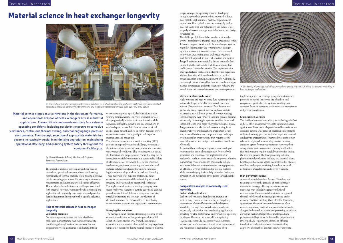 High-performance alloys Advanced materials such as Inconel, Hastelloy, and titanium represent the pinnacle of heat exchanger material technology, offering superior corrosion resistance even in highly aggressive chemical environments. These materials maintain exceptional thermal stability and mechanical properties under extreme conditions, making them ideal for demanding applications. However, their implementation often involves significant material and manufacturing costs, along with the need for specialized processing techniques during fabrication. Despite these challenges, highperformance alloys prove indispensable in applications involving high-temperature operations, offshore installations, and environments characterized by aggressive chemicals or constant seawater exposure. www. heat-exchanger-world. com Heat Exchanger World June 2025