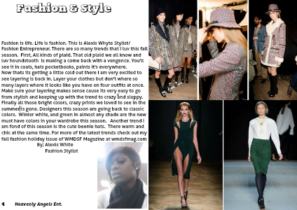 Finally all those bright colors, crazy prints we loved to see in the summer is gone. Designers this season are going back to classic colors. Winter white, and green in almost any shade are the new must have colors in your wardrobe this season. Another trend I am fond of this season is the cute beenie hats. There warm and chic at the same time. For more of the latest trends check out my fall fashion holiday issue of WMDSF Magazine at wmdsfmag.com
