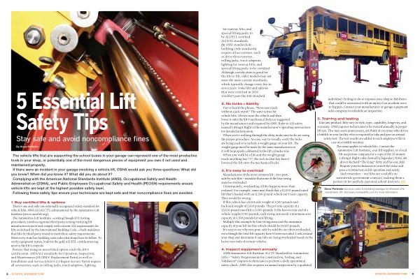 1 . Buy certified lifts & options There ’ s one and only one nationally recognized safety standard for vehicle lifts : ANSI-ALI / ALCTV , administered by the Automotive Lift Institute ( www . autolift . org ). The Automotive Lift Institute , working though ETL testing procedures , involves rigorous third-party testing verifying lift manufacturers meet and comply with current ALI requirements for lifts as defined by the International Building Code , which mandates that lifts be third party tested to meet these safety requirements . Most every state has building code rules that shops have to follow . To verify equipment status , look for the gold ALI / ETL certification tag next to the lift ’ s controls . Beware that using an uncertified option voids the lift ’ s certification . ANSI / ALI standards for Operation , Inspection , and Maintenance ( ALOIM 8 . Replacement Parts ) as well as Installation and Service ( ALIS 6.2.6 Repair Service Parts ) require all accessories , such as rolling jacks , truck adaptors , lighting