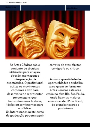 As Artes Cênicas são o conjunto de técnicas utilizadas para criação, direção, montagem e interpretação de espetáculos. O profissional utiliza os movimentos corporais e voz para desenvolver e representar personagens que transmitem uma história, ideias ou sentimentos para o público.