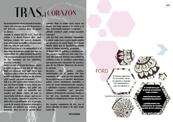 Salí a la calle para volver tomar un bus que me llevara hasta tu casa, hasta que un policía me detuvo, me pidió mis documentos. Corrí, no entendía que pasaba, por alguna razón, mi ropa se encontraba teñida de sangre, que no era mía. De pronto, comencé a recordar, era miércoles y paseábamos por el parque, cuando de pronto un hombre comenzó a disparar, me gritaste que corriera, que escapara, pero yo no te quería dejar. Cuando diste la vuelta para tomar mi mano, una bala atravesó tu pecho y el mío, impactando nuestros corazones.