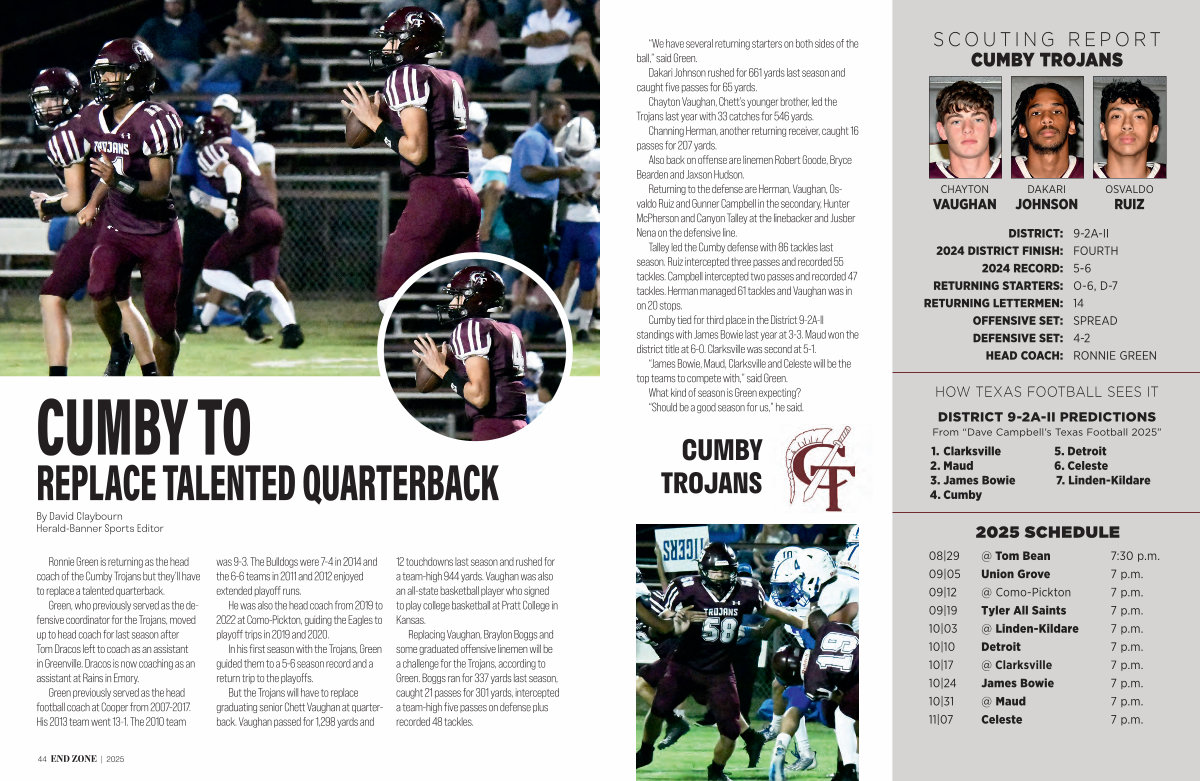 Talley led the Cumby defense with 86 tackles last season. Ruiz intercepted three passes and recorded 55 tackles. Campbell intercepted two passes and recorded 47 tackles. Herman managed 61 tackles and Vaughan was in on 20 stops.