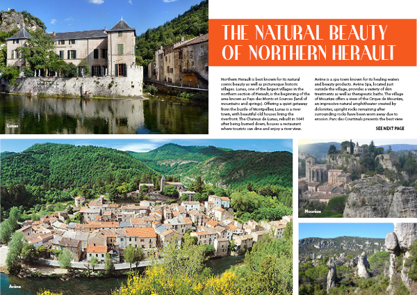 Northern Herault is best known for its natural scenic beauty as well as picturesque historic villages. Lunas, one of the largest villages in the northern section of Herault, is the beginning of the area known as Pays des Monts et Sources (land of mountains and springs). Offering a quiet getaway from the bustle of Montpellier, Lunas is a river town, with beautiful old houses lining the riverfront. The Chateux de Lunas, rebuilt in 1641 after being burned down, houses a restaurant where tourists can dine and enjoy a river view. Avène is a spa town known for its healing waters and beauty products. Avène Spa, located just outside the village, provides a variety of skin treatments as well as therapeutic baths. The village of Mourèze offers a view of the Cirque de Mourèze, an impressive natural amphitheater created by dolomites, upright rocks remaining after surrounding rocks have been worn away due to erosion. Parc des Courtinals presents the best view