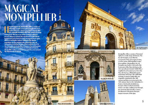 Montpellier offers a variety of historical sights for a wide range of interests. The Arc de Triomphe, much like the monument of the same name in Paris, is at the center of Montpellier’s major thoroughfare. Montpellier’s Arc de Triomphe was built in 1689 and is the focal point of the Place de Peyrou, the city’s upscale promenade. Vieille Ville, a neighborhood located across from the Place de Peyrou, is filled with quaint restaurants and shops. The Cathedrale St-Pierre, located in Vieille Ville, was originally completed in the 14th century and later reconstructed in the 18th century. Next to the Cathedrale St-Pierre is the Faculté de Médecine, Europe’s oldest medical university. Visitors can take a walking tour through the university that includes a visit to the Museum of Anatomy, Europe’s largest museum of this type.