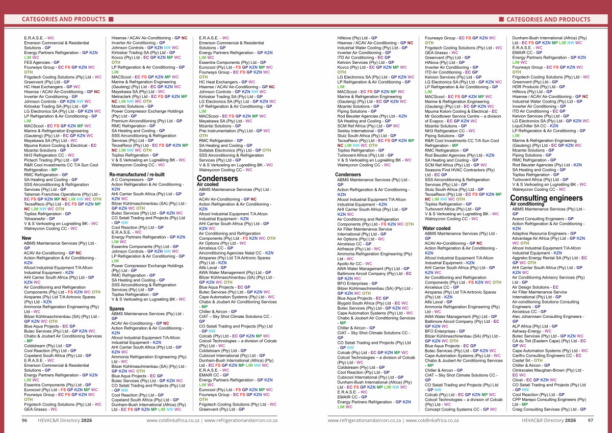 ABMS Maintenance Services( Pty) Ltd- GP ACAV Air-Conditioning- GP NC Action Refrigeration & Air Conditioning- KZN Afcool Industrial Equipment T / A Afcon Industrial Equipment- KZN AHI Carrier South Africa( Pty) Ltd- GP KZN WC Air Conditioning and Refrigeration Components( Pty) Ltd- FS KZN WC OTH Air Options( Pty) Ltd- WC Aircelsius CC- GP Airconditioning Agencies Natal CC- KZN Airspares( Pty) Ltd T / A Airtronic Spares( Pty) Ltd- KZN Alfa Laval- GP AWA Water Management( Pty) Ltd- GP Bitzer Kühlmaschinenbau( SA)( Pty) Ltd- GP KZN WC OTH Blue Aqua Projects- EC GP Butec Services( Pty) Ltd- GP KZN WC Cape Automation Systems( Pty) Ltd- WC Chabo & Joubert Air Conditioning Services- MP Chiller & Aircon- GP CIAT – Sky Shot Climate Solutions CC- GP CO Setati Trading and Projects( Pty) Ltd- GP NW Colcab( Pty) Ltd- EC GP KZN MP WC Colcoil Technologies – a division of Colcab( Pty) Ltd- WC Coldstream( Pty) Ltd- GP Cubicool International( Pty) Ltd- GP Dunham-Bush International( Africa)( Pty) Ltd- EC FS GP KZN MP LIM NW WC E. R. A. S. E.- WC EMAIR CC- GP Energy Partners Refrigeration- GP KZN LIM WC Eurocool( Pty) Ltd- FS GP KZN MP WC Fourways Group- EC FS GP KZN WC OTH Frigotech Cooling Solutions( Pty) Ltd- WC Greenvent( Pty) Ltd- GP