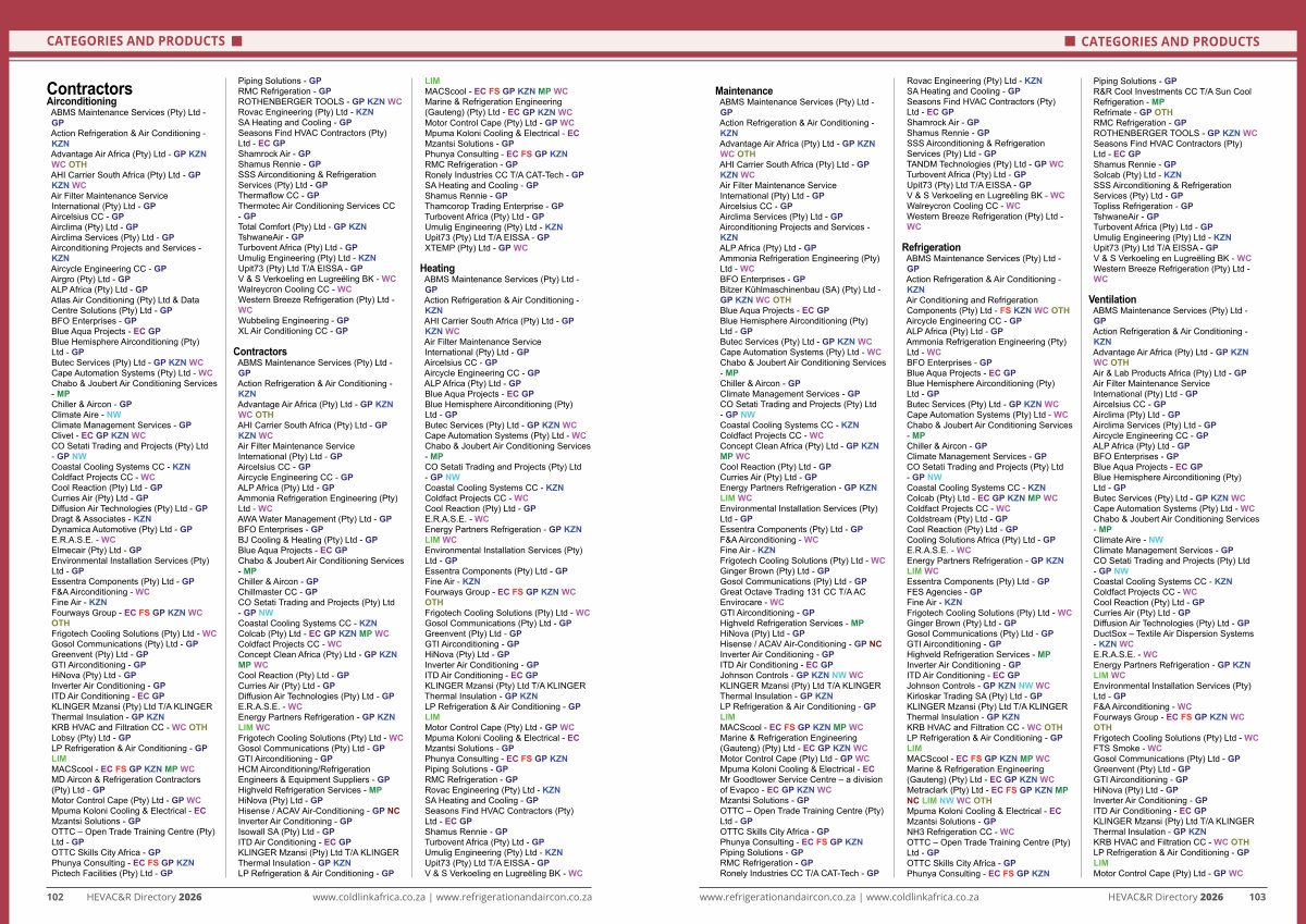 www. refrigerationandaircon. co. za | www. coldlinkafrica. co. za HEVAC & R Directory 2026 103