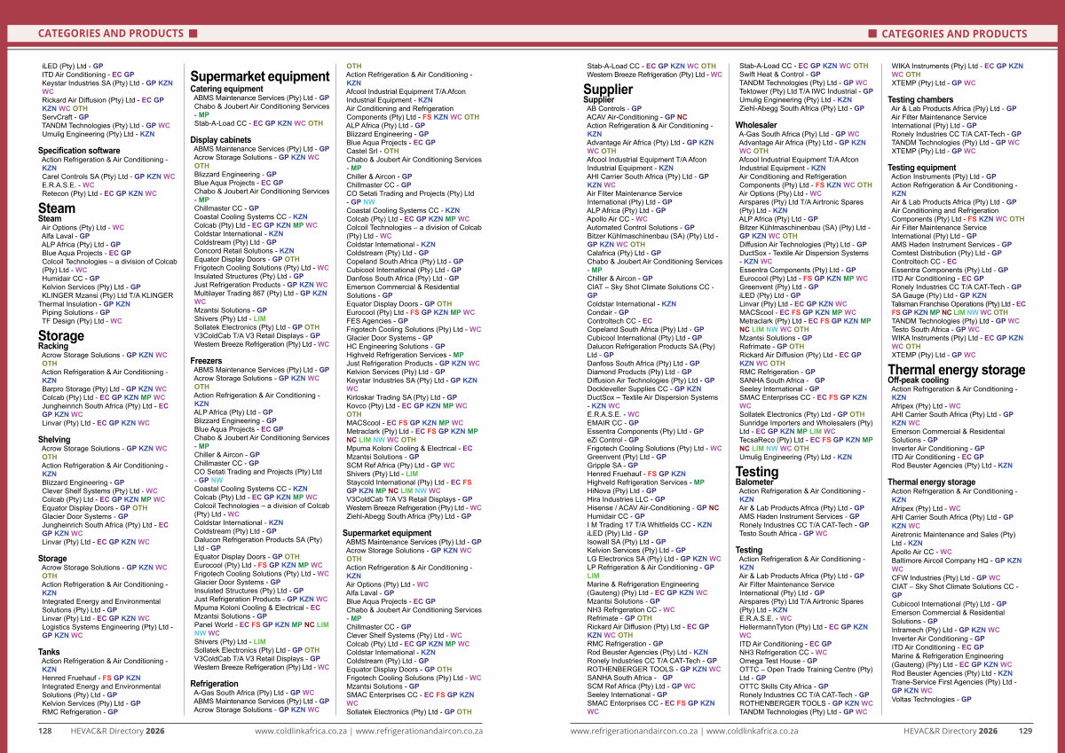 Acrow Storage Solutions- GP KZN WC OTH Action Refrigeration & Air Conditioning- KZN Blizzard Engineering- GP Clever Shelf Systems( Pty) Ltd- WC Colcab( Pty) Ltd- EC GP KZN MP WC Equator Display Doors- GP OTH Glacier Door Systems- GP Jungheinrich South Africa( Pty) Ltd- EC GP KZN WC Linvar( Pty) Ltd- EC GP KZN WC