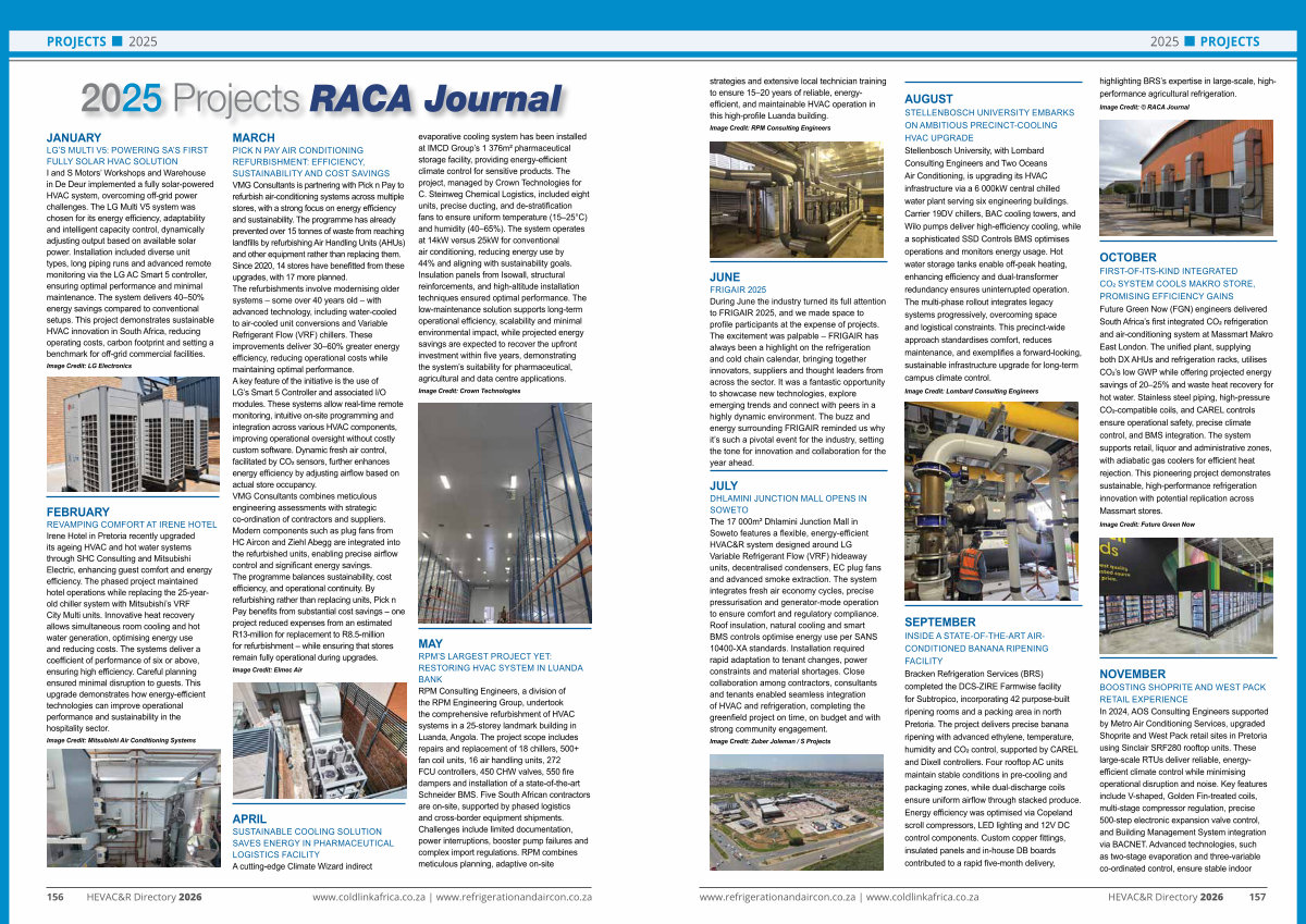 PICK N PAY AIR CONDITIONING REFURBISHMENT: EFFICIENCY, SUSTAINABILITY AND COST SAVINGS VMG Consultants is partnering with Pick n Pay to refurbish air-conditioning systems across multiple stores, with a strong focus on energy efficiency and sustainability. The programme has already prevented over 15 tonnes of waste from reaching landfills by refurbishing Air Handling Units( AHUs) and other equipment rather than replacing them. Since 2020, 14 stores have benefitted from these upgrades, with 17 more planned. The refurbishments involve modernising older systems – some over 40 years old – with advanced technology, including water-cooled to air-cooled unit conversions and Variable Refrigerant Flow( VRF) chillers. These improvements deliver 30 – 60 % greater energy efficiency, reducing operational costs while maintaining optimal performance. A key feature of the initiative is the use of LG’ s Smart 5 Controller and associated I / O modules. These systems allow real-time remote monitoring, intuitive on-site programming and integration across various HVAC components, improving operational oversight without costly custom software. Dynamic fresh air control, facilitated by CO2 sensors, further enhances energy efficiency by adjusting airflow based on actual store occupancy. VMG Consultants combines meticulous engineering assessments with strategic co-ordination of contractors and suppliers. Modern components such as plug fans from HC Aircon and Ziehl Abegg are integrated into the refurbished units, enabling precise airflow control and significant energy savings. The programme balances sustainability, cost efficiency, and operational continuity. By refurbishing rather than replacing units, Pick n Pay benefits from substantial cost savings – one project reduced expenses from an estimated R13-million for replacement to R8.5-million for refurbishment – while ensuring that stores remain fully operational during upgrades.