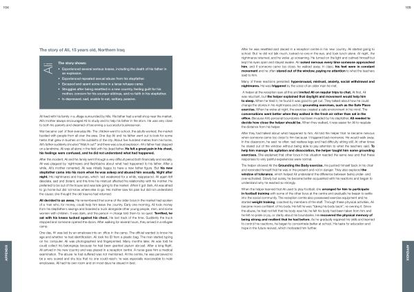 A helper at the reception saw all this and invited Ali on regular trips to chat . At first , Ali was reluctant , but the helper explained that daylight and movement would help him to sleep . When he tried it , he found it was good to get out . They talked about how he could change the stories in his nightmares and do grounding exercises , such as the Safe Place exercise . When he woke at night , the exercise created a safe environment in his mind . The conversations went better when they walked in the fresh air rather than sat in the office . Because Ali ’ s personal boundaries had been invaded by his stepfather , Ali needed to decide how close the helper should be . When they walked , it was easier for Ali to regulate the distance from his helper .