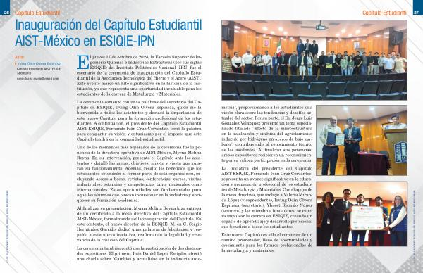 La iniciativa del presidente del Capítulo AIST-ESIQIE , Fernando Iván Cruz Cervantes , representa un avance significativo en la educación y preparación profesional de los estudiantes de Metalurgia y Materiales . Con el apoyo de la mesa directiva , que incluye a Valeria Miranda López ( vicepresidenta ), Irving Odin Olvera Espinoza ( secretario ), Yhoset Ricardo Núñez ( tesorero ) y los miembros fundadores , se espera impulsar la carrera en ESIQIE , creando un espacio de aprendizaje y desarrollo profesional que beneficie a todos los estudiantes .