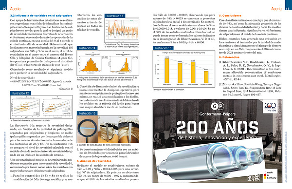 Con apoyo de herramientas estadísticas se realizaron regresiones con el fin de identificar las principales variables que influyen en el fenómeno de salpicadero en molde, para lo cual se designó un grado de severidad con números discretos de acuerdo con el fenómeno observado durante la operación de la colada continua, en una escala del 0 al 4 siendo 4 el nivel más alto de severidad. Determinando que los factores con mayor influencia en la severidad del salpicadero son % Zn y % Sn en el acero, el nivel de reoxidación en el acero entre el proceso del Horno Olla y Máquina de Colada Continua( Δ ppm O2), temperatura promedio de trabajo en el distribuidor( T DIST) y las horas de trabajo de este( t DIST).