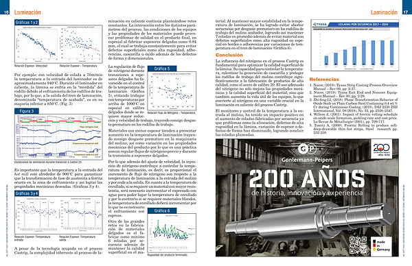 Por ejemplo: con velocidad de colada a 70m / min la temperatura a la entrada del laminador es de aproximadamente 940 ° C. Durante el laminador en caliente, la lámina se enfría en la“ mordida” del rodillo debido al enfriamiento de los rodillos de trabajo, por lo que, a la salida del tren de laminación, denominada“ temperatura de acabado”, es en su mayoría inferior a 850 ° C.( Fig. 3)
