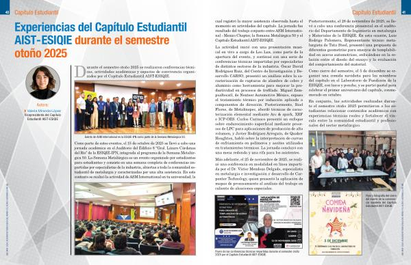 Como parte de estos eventos, el 15 de octubre de 2025 se llevó a cabo una jornada académica en el Auditorio del Edificio 8“ Gral. Lázaro Cárdenas del Río” de la ESIQIE-IPN, integrada al programa de la Semana Metalúrgica 50. La Semana Metalúrgica es un evento organizado por estudiantes para estudiantes y consiste en una semana completa de conferencias impartidas por especialistas de la industria, abiertas a toda la comunidad estudiantil de metalurgia y caracterizadas por una alta asistencia. En este contexto se realizó la actividad de ASM International en tu universidad, la