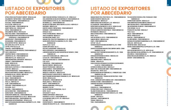 SUPERFICIALES- STAND NUMERADO 225 AUMUND GROUP- STAND NUMERADO 149 BCB INGENIERIA- STAND NUMERADO 701 BOSCH REXROTH MEXICO- MEDIA ISLA W BRC GLOBAL ROLLS LTD PTE- ISLA 6A CALIDRA- MEDIA ISLA A2 y A5 CANACERO- STAND NUMERADO 228 CANACINTRA DELEGACIÓN VERACRUZ- STAND NUMERADO 227 CAPSA- MEDIA ISLA O CHEMTREAT MEXICO- STAND NUMERADO 203 CHNZBTECH CO., LTD.- STAND NUMERADO 801 CIMM GROUP CO., LTD.- MEDIA ISLA A25 CNBM INTERNATIONAL CORPORATION- MEDIA ISLA A COMBILIFT- STAND NUMERADO 503 DANIELI- MEDIA ISLA 2A DICOFASA- MEDIA ISLA N y Q DIXON VALVE & COUPLING C. O.- STAND NUMERADO 106 ECON TECH- MEDIA ISLA S E-CRANE INTERNATIONAL- STAND NUMERADO 133 EINSA POLYURETHANE ELASTOMERS- MEDIA ISLA D y J EISENWERK SULZAU- WERFEN- MEDIA ISLA O ELI LOGISTIX- STAND NUMERADO 130 EMAAC- STAND NUMERADO 125 EMG AUTOMATION GMBH- MEDIA ISLA U FIVES, S. A.- MEDIA ISLA 2B FLUKE- STAND NUMERADO 142 FORTACERO- STAND NUMERADO 122 y 123 FRC GLOBAL- ISLA 7 GALVAROLL- STAND NUMERADO 113 GECSA CONDUCTORS- STAND NUMERADO 135 GEORG FISCHER- STAND NUMERADO 402 GEORG NORTH AMERICA INC.- STAND NUMERADO 401 GRACIDA EQUIPOS MAGNETICOS S. A. DE C. V.- MEDIA ISLA A16 GRUPO TORNO INDUSTRIAL- STAND NUMERADO 403 HARBISONWALKER INTERNATIONAL- MEDIA ISLA A32 HEAVY GOYO( GUANGZHOU) MECHANICAL EQUIPMENT CO., LTD.- STAND