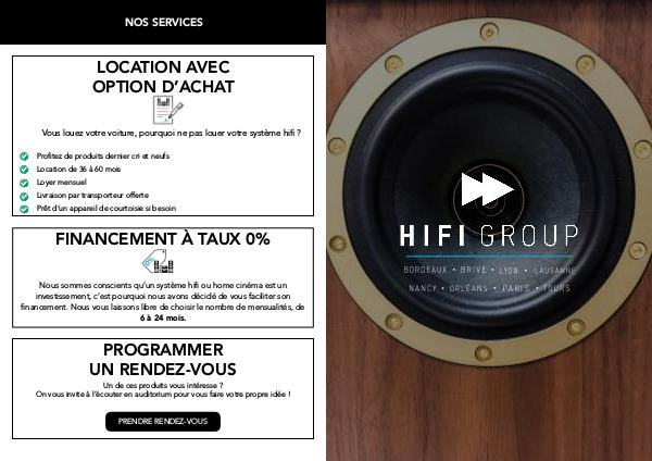 NOS SERVICES LOCATION AVEC OPTION D’ACHAT Vous louez votre voiture, pourquoi ne pas louer votre système hifi ? Profitez de produits dernier cri et neufs Location de 36 à 60 mois Loyer mensuel Livraison par transporteur offerte Prêt d’un appareil de courtoisie si besoin FINANCEMENT À TAUX 0% Nous sommes conscients qu’un système hifi ou home cinéma est un investissement, c’est pourquoi nous avons décidé de vous faciliter son financement. Nous vous laissons libre de choisir le nombre de mensualités, de 6 à 24 mois. PROGRAMMER UN RENDEZ-VOUS Un de ces produits vous intéresse ? On vous invite à l’écouter en auditorium pour vous faire votre propre idée ! PRENDRE RENDEZ-VOUS